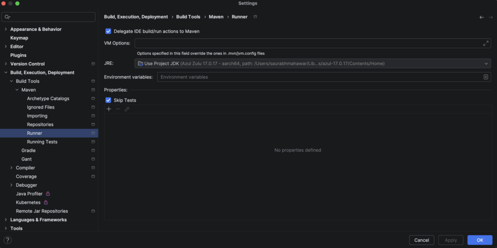 - Go to Maven → Runner → Enable Skip Tests → Click Apply → OK